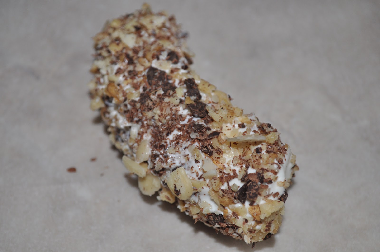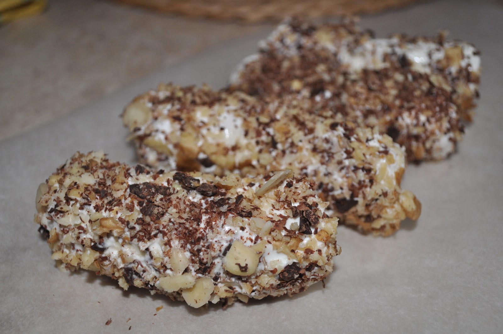 Banany obieramy i kroimy na pół. Obieramy orzechy włoskie i miażdżymy (można w młynku do kawy, albo np. przy pomocy wałka do ciasta). To samo robimy z płatkami migdałowymi. Czekoladę ścieramy na tarce o małych oczkach. Wszystkie te sypkie składniki łączymy w miseczce. Kawałki banana maczamy w jogurcie greckim i obtaczamy sypkimi składnikami. Trzeba się trochę pobrudzić 🙂 Wkładamy do lodówki na 20 min. Można nadziać na patyczki do lodów, ale ja niestety nie miałam.