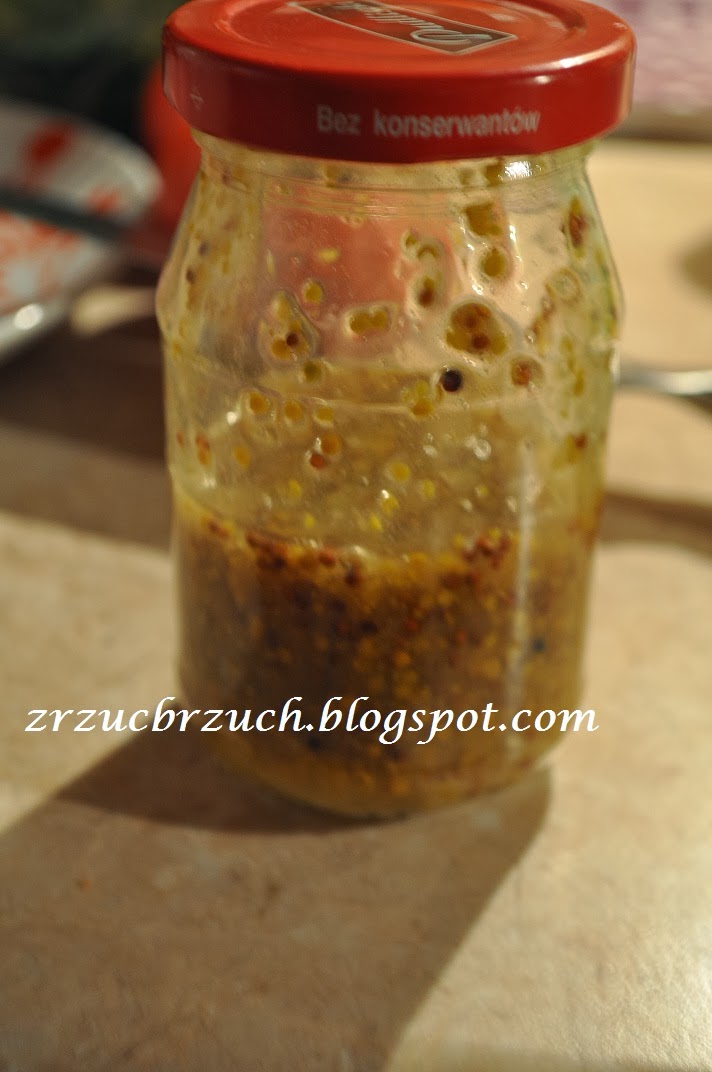 Musztardę i miód mieszamy w małej misce z dodatkiem soli i pieprzu. Można wykorzystać patent który widziałem u Karola Okrasy, wszystko mieszamy w zamkniętym małym słoiku. Tak jest znacznie łatwiej.
