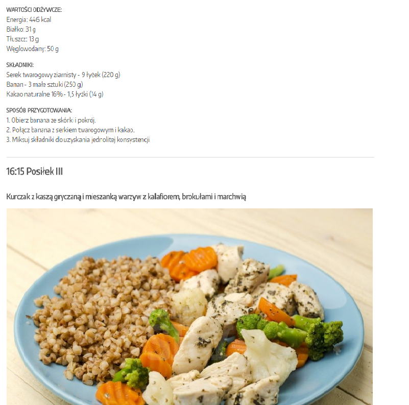 Jak widać mamy dokładnie napisane składniki, sposób przygotowania oraz podział makroskładników danego posiłku , ile ma kalorii oraz w jakich godzinach powinniśmy go jeść. Znajdziemy również zdjęcie poglądowe jak posiłek powinien wyglądać. Nic prostszego nawet facet taki jak ja ze średnią umiejętnością gotowania sobie radzi 🙂 Dużo ludzi marudzi, że te rzeczy wyglądają ładnie tylko na zdjęciach, dieta jest potem jałowa i mało smaczna. Żeby nie być gołosłownym wrzucam Wam fotki dań z fabryki siły przygotowanych przeze mnie. Fabryka siły opinia Fabryka siły opinia Fabryka siły opinia Fabryka siły opinia Fabryka siły opinia Fabryka siły opinia       Jak widać daleko im od jałowego kurczaka z gotowanym ryżem 🙂