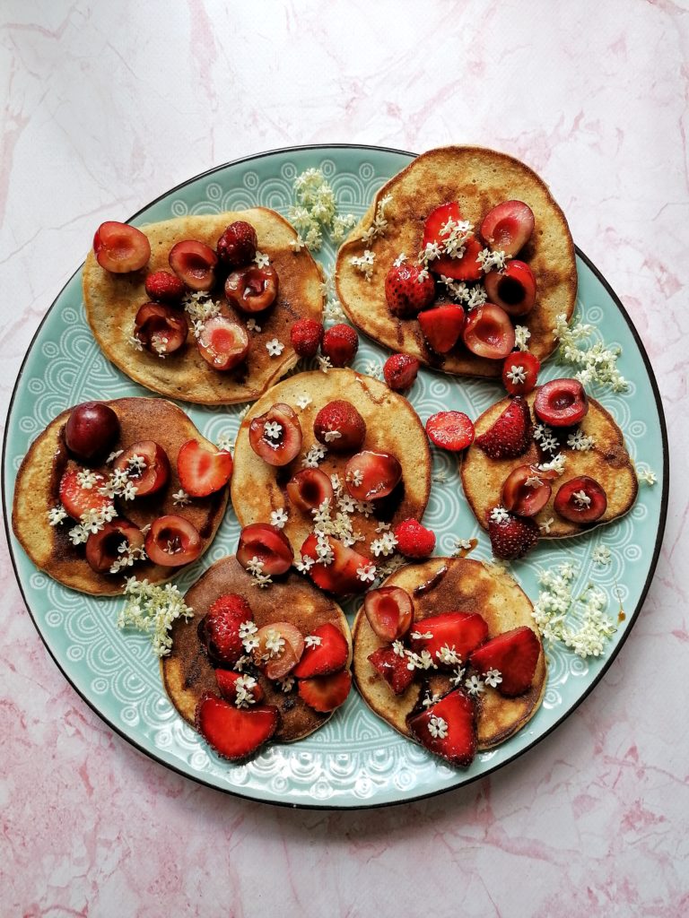 Dziś placuszki lub jak kto woli pancakes, czyli moja ulubiona forma śniadaniowa obok omletów i owsianek. Pancakes też można podać ze wszystkim co Wam się zamarzy i zawsze będą pycha, o ile macie na nie dobry podstawowy przepis i tu przychodzę z pomocą ja. Poniżej podaję przepis na idealne pancakes. Moje akurat były z truskawkami i czereśniami, posypane kwiatami czarnego bzu (tylko dla dekoracji, surowe są niejadalne!), ale tak jak pisałam możecie takie placuszki podawać z czym lubicie. Moja najulubieńsza opcja to banan i rozpuszczona czekolada albo owoce leśne i syrop daktylowy.