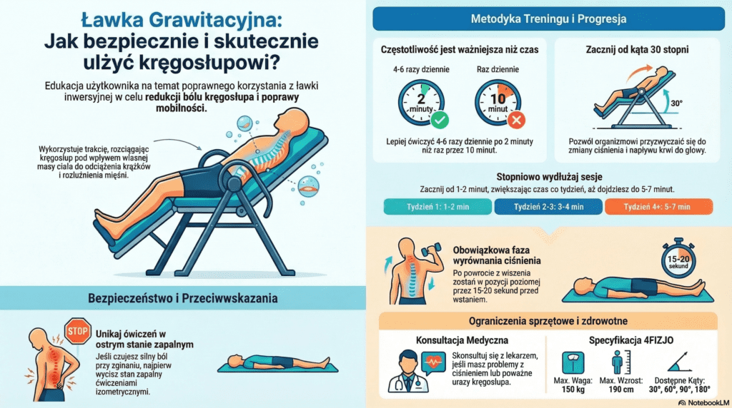 Mimo licznych zalet, należy zachować ostrożność. Zdecydowanie odradza się korzystania z ławki w ostrych stanach zapalnych, gdy ból jest bardzo silny i świeży – w takim przypadku trakcja może wręcz pogorszyć stan. Osoby z nadciśnieniem, problemami z krążeniem lub po poważnych urazach muszą bezwzględnie skonsultować się z lekarzem przed rozpoczęciem ćwiczeń. Ważnym elementem bezpieczeństwa jest także faza powrotu: po pionizacji należy pozostać w pozycji poziomej przez około 15-20 sekund, aby wyrównać ciśnienie i uniknąć zawrotów głowy czy utraty przytomności.